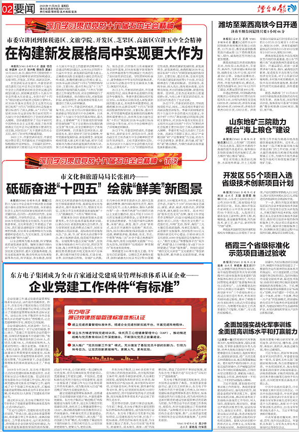 企业党建工作通过党建质量管理标准体系专业认证,这在我市尚属首次。昨天上午,在山东宁森环保科技有限公司党员创新工作室,公司党委副书记李成山向记者展示了党建质量管理标准体系达标认证证书。这也让山东宁森环保科技有限公司在全市企业中率先开启党建“标准化”管理模式,让企业党建朝着科学化、规范化方向发展。